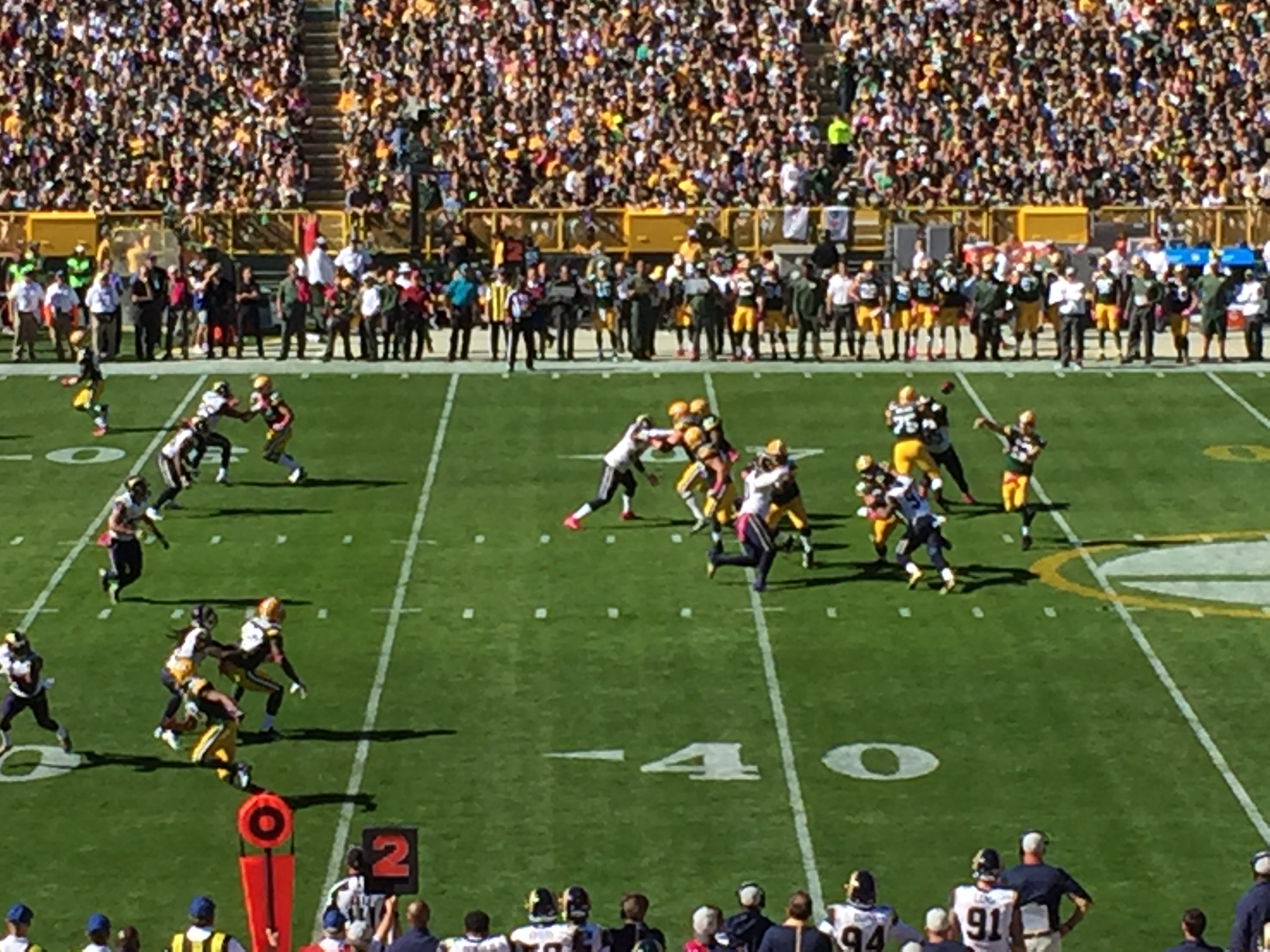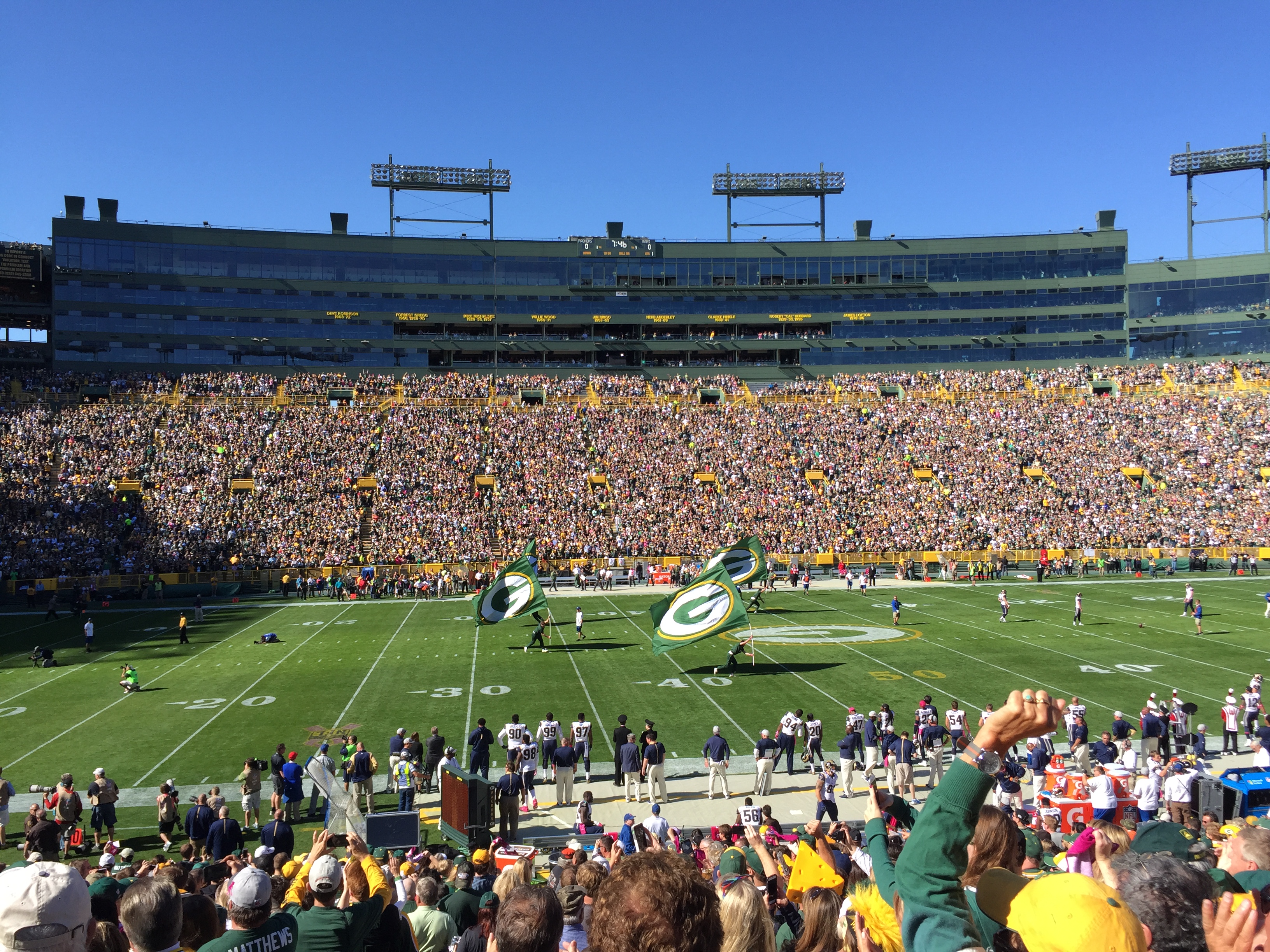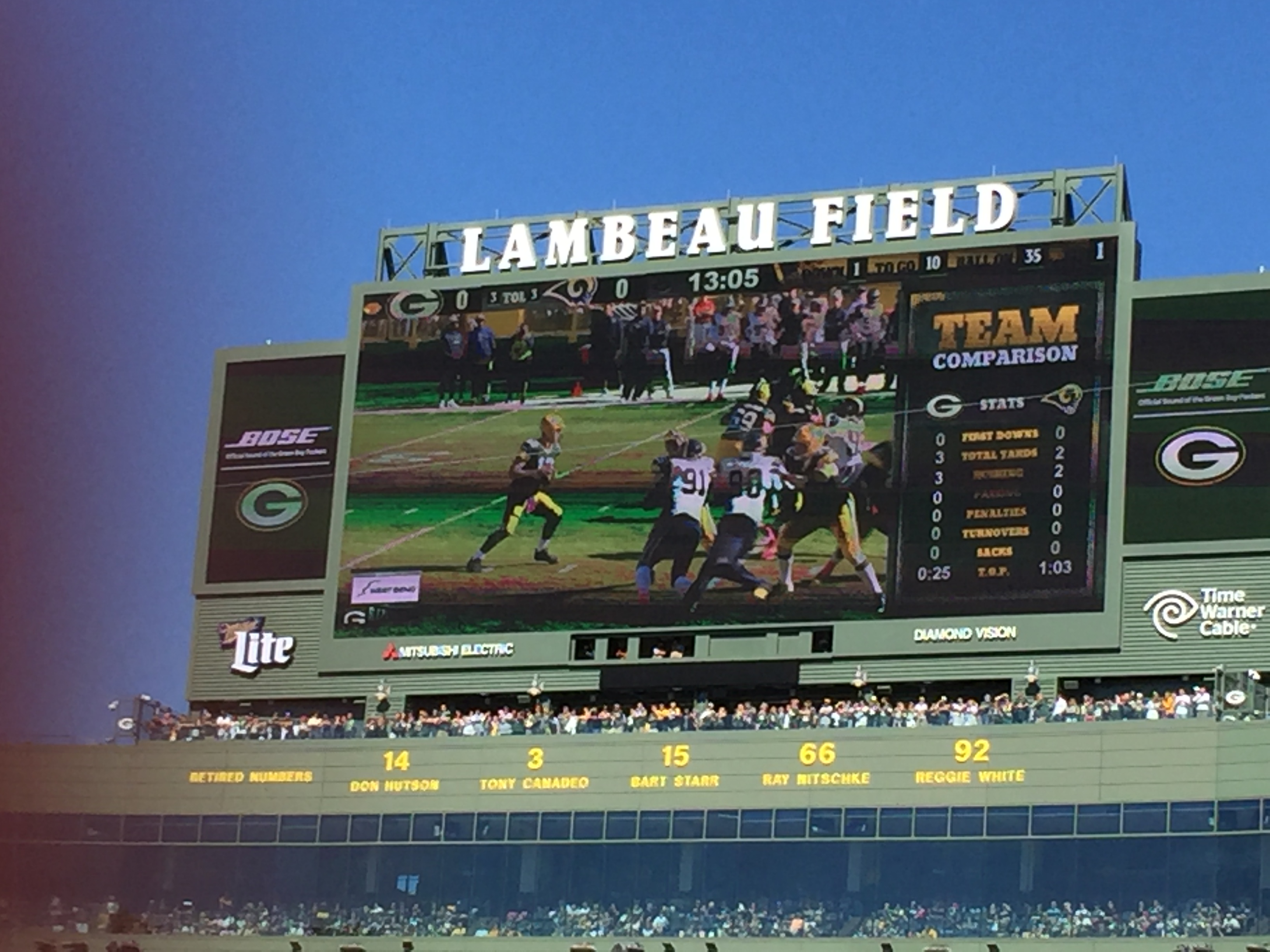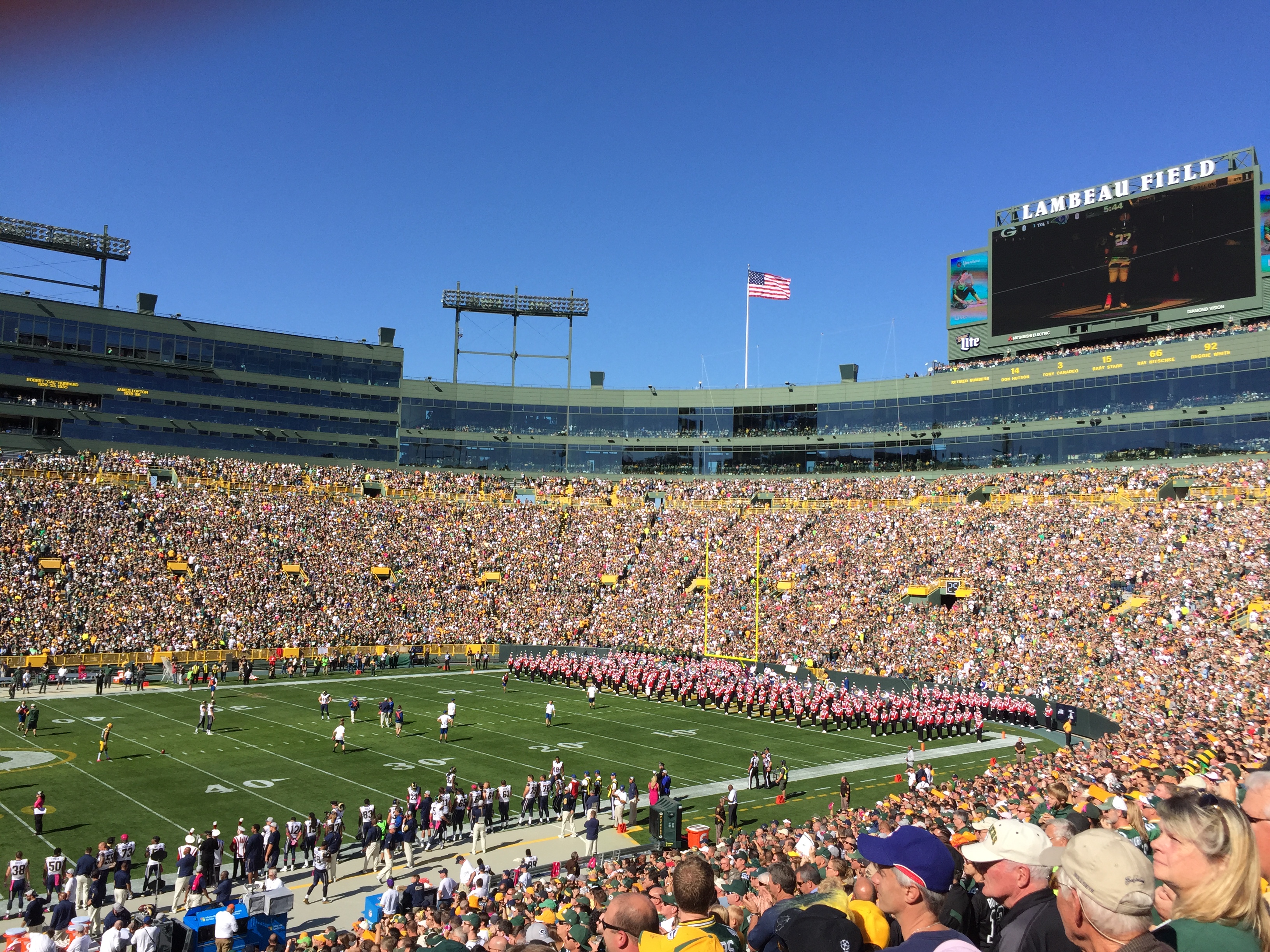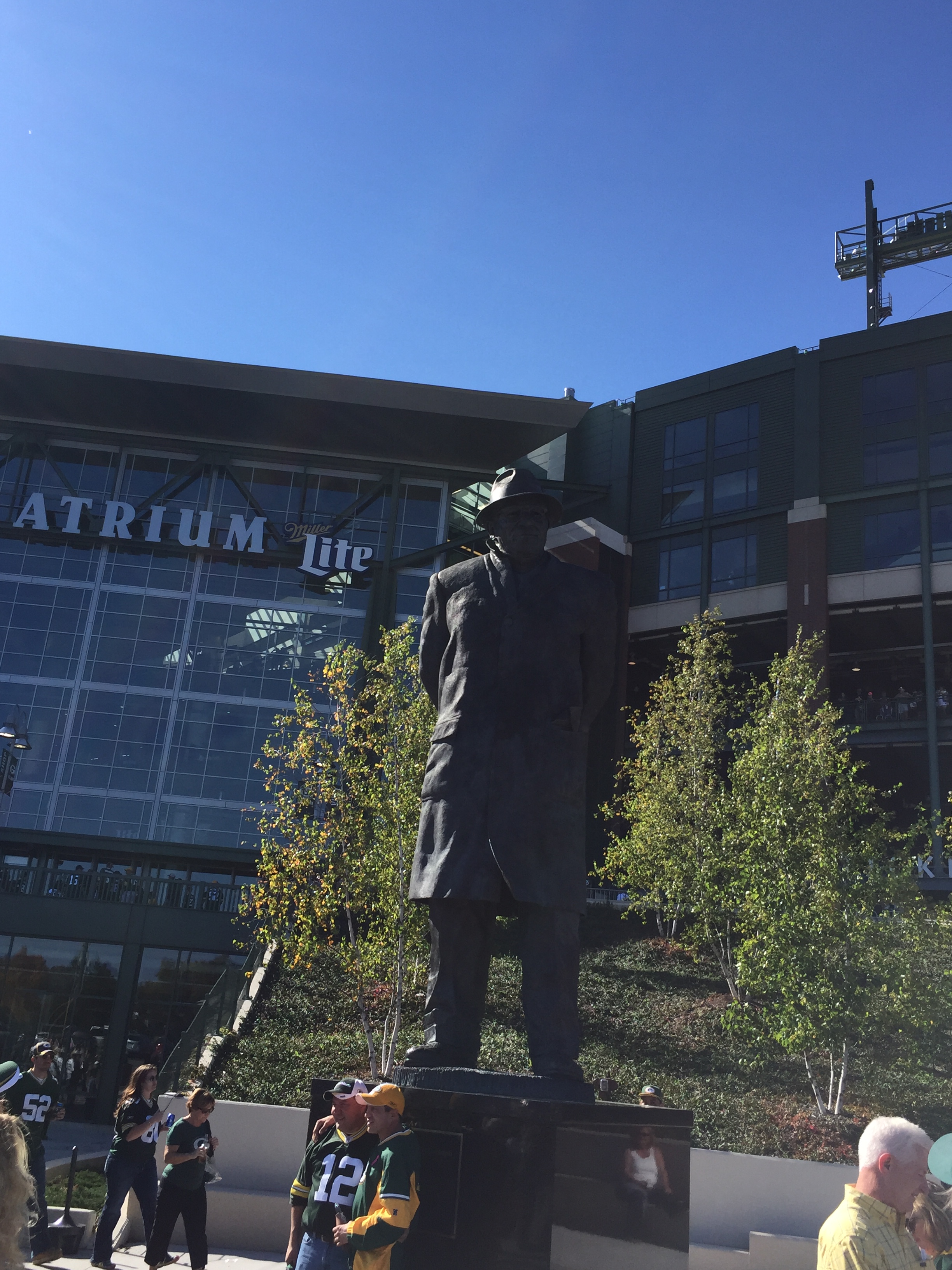 I had the amazing experience of going to Lambeau field for the first time in Week 5. I got to see the Packers take on my Rams, but I almost didn’t even notice that my team was playing. The place was electric! Green Bay is such a small town, and the sense of community showed around the stadium. It’s literally surrounded by a residential area, and every block was filled with Packers fans and people tailgating in their driveways. Gameday was literally a way of life here, and what everybody rallied around. They had tailgating tents outside the field, and we were able to grab a beer and cheesecurds while walking by Vince Lombardi. We finally got to go in, and went from walking in the crowded concourse to stepping out and having the entire field open up in front of us. The second I walked out, I almost felt hit by a rush of NFL history, it was truly amazing. The ring of honor had names like Bart Starr, Ray Nitschke, and Reggie White. All I could picture was that someone sat in my seat to watch the Ice Bowl, or to watch Brett Favre play, or that Vince Lombardi stood on those sidelines. Even as a Rams fan, I got distracted. The game was fun but frustrating. I wish I could have cheered along with the home crowd. The best part happened after the first Packer touchdown. Everybody in the stands were high fiving, and the guy ahead of me hits 3 people, turns to me with his hand in the air, and I’m just shaking head with my arms crossed. He thought that was hilarious, and I felt semi-proud for leaving him hanging. Overall it was an awesome venue to watch a football game. Half the stadium stayed to watch the Badger marching band perform at the end of the game.