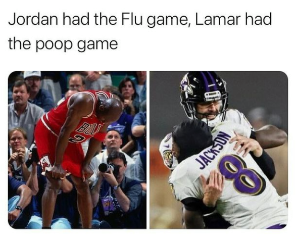 Before we get into the poop jokes, the Ravens game was truly the game of the year. 35 points were scored in the 4th quarter, the Browns came back from being down by 14 and there were 3 lead changes after that, and in the last 6:00, the win probability shifted teams 7 times! Jackson went down (more on that to come, hehe) and it looked like the Browns were going to run away with it. Especially when the Ravens Backup went down! Then Lamar magically returned the very next play and led them to a TD.